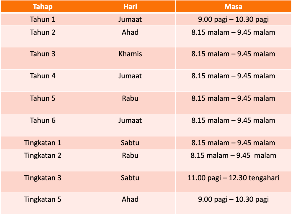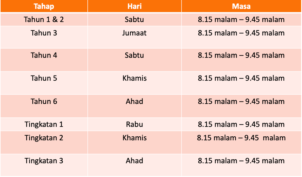✅ Kelas dijalankan selama 1 Jam 30 Minit jam setiap minggu mengikut jadual yang disediakan